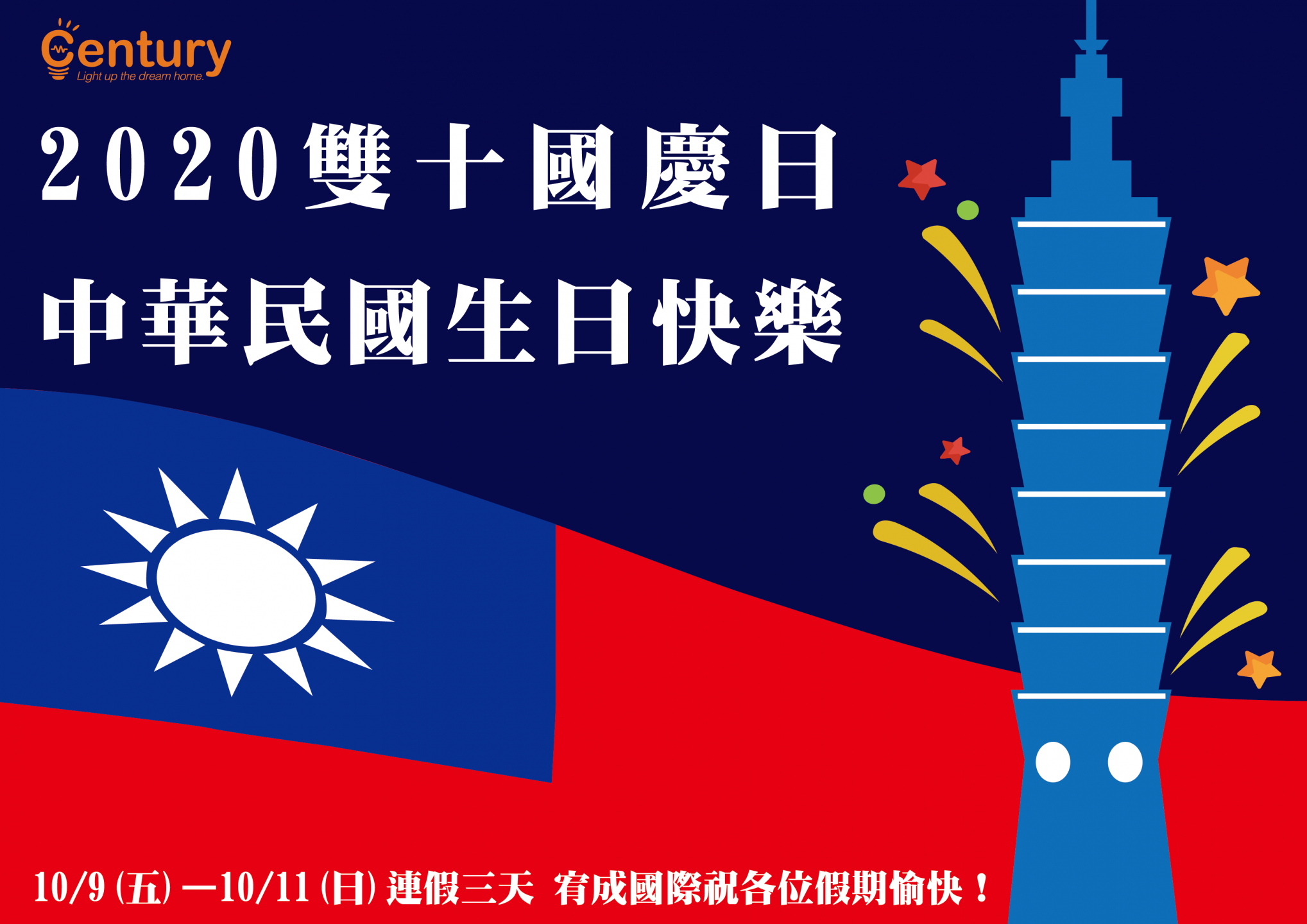 2020/10/10 雙十國慶日 祝各位假期愉快! 中華民國生日快樂 10/9~10/11 連假三天 <國慶日的由來> 中華民國的國慶日,又稱雙十節或雙十國慶,此由來係為武昌起義的發動日為1911年10月10日,是辛亥革命的開端, 在起事後的兩個月內,中國各地的革命行動陸續成功,最終成功推翻清朝。 而於隔年(1912年)的元旦,孫文正式就任第一任中華民國臨時大總統,中華民國正式建立,並為民國元年。 故將10月10日定為中華民國的國慶日,而元旦(1月1日)則為中華民國開國紀念日。