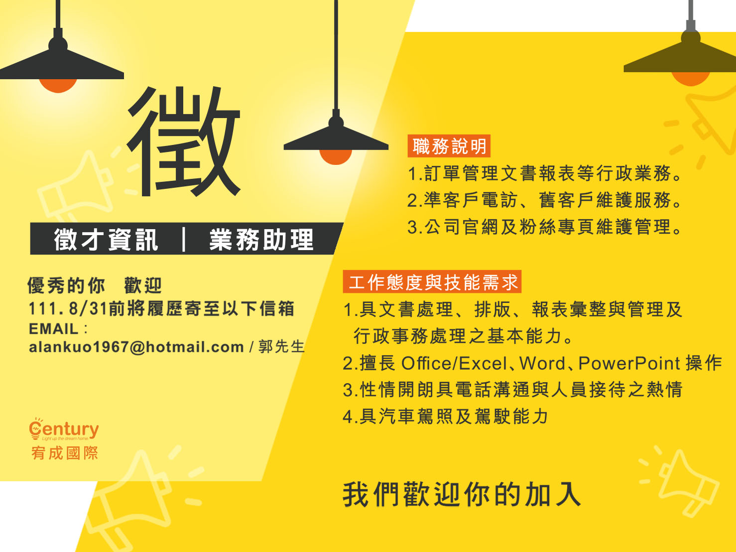 3. 性情開朗具電話溝通與人員接待之熱情。