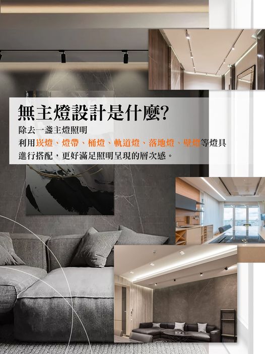 無主燈設計重點在於除去一盞主燈照明,利用崁燈、燈帶、桶燈、軌道燈、落地燈、壁燈等燈具進行搭配,更好滿足照明呈現的層次感。